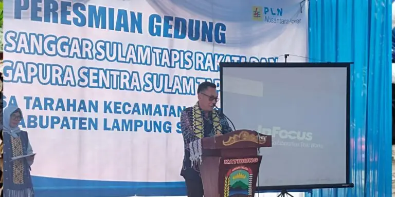 KORANLAMPUNG.ID,Katibung,Lampung Selatan–Bupati Lampung Selatan Radityo Egi Pratama diwakili Staf Ahli Bupati Bidang Keuangan Achmad Herry, SE.,M.M hari ini secara resmi meresmikan Gedung Galeri Sanggar Sulam Tapis Rakata dan Gapura Sentra Tapis yang dipusatkan di Desa Tarahan, Kecamatan Katibung Lampung Selatan, pada.Kamis (23/10/2025) pagi.