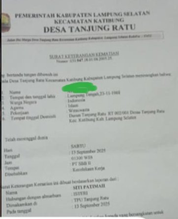 Hal itu baru di ungkapkan oleh Siti patimah (34) istri dari AR yang sangat terpukul atas kepergian suaminya pasca mengalami kecelakaan kerja di lokasi PT.Sumber Batu Berkah (SBB) 2, yang terletak di Desa Sukajaya dan Tanjung ratu, Kecamatan katibung, kabupaten Lampung Selatan, pada hari Sabtu (13/9/2025) pukul 13.00.wib.