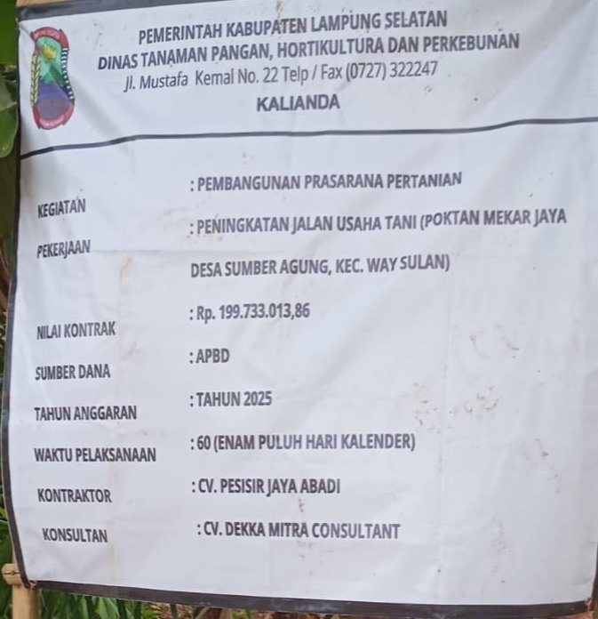 KORANLAMPUNG.ID,Lampung Selatan–Proyek pembangunan jalan prasarana pertanian di Desa Sumber Agung, Kecamatan Way Sulan, Kabupaten Lampung Selatan, senilai Rp 199.733.013,85 dari APBD, kini menjadi sorotan tajam. Pasalnya, kualitas pengerjaan proyek yang seharusnya mempermudah akses petani ini, diduga jauh dari harapan, memicu kekecewaan mendalam di kalangan masyarakat.