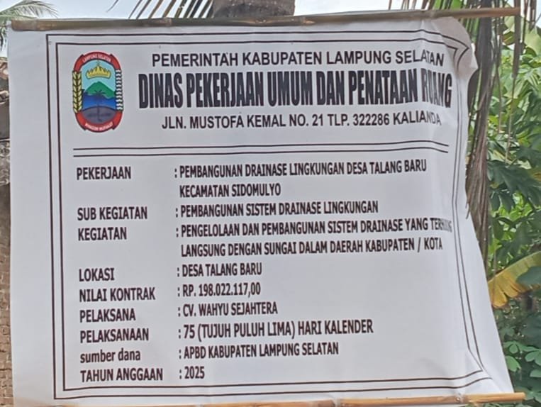 untuk diketahui pengerjaan proyek pembangunan drainase di lingkungan Desa Talang baru kecamatan Sidomulyo itu di kerjakan oleh pihak rekanan pelaksana CV Wahyu Sejahtera, dengan nilai kontrak senilai Rp 198.022.117 (seratus sembilan puluh delapan juta dua puluh dua ribu seratus tujuh belas rupiah) bersumber dari Dana APBD Tahun anggaran 2025 melalui Dinas pekerjaan umum dan Penataan ruang PUPR Kabupaten Lampung Selatan.