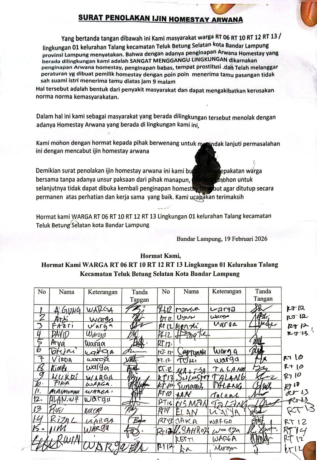 Mendesak agar izin usaha Arwana Inn Homestay dicabut secara resmi, karena diduga disalahgunakan dan meresahkan warga lingkungan setempat maka warga minta Penutupan secara paksa