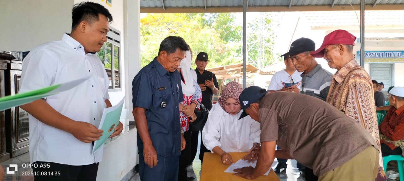 Katibung, Lampung Selatan–Kepala Desa transtanjungan Drs.Alwi Amir berikan 24 Sertifikat Exist tol secara gratis terhadap warganya, kegiatan berlangsung di aula kantor desa Transtanjungan, Kecamatan Katibung Kabupaten Lampung Selatan, Rabu (8/10/2025)