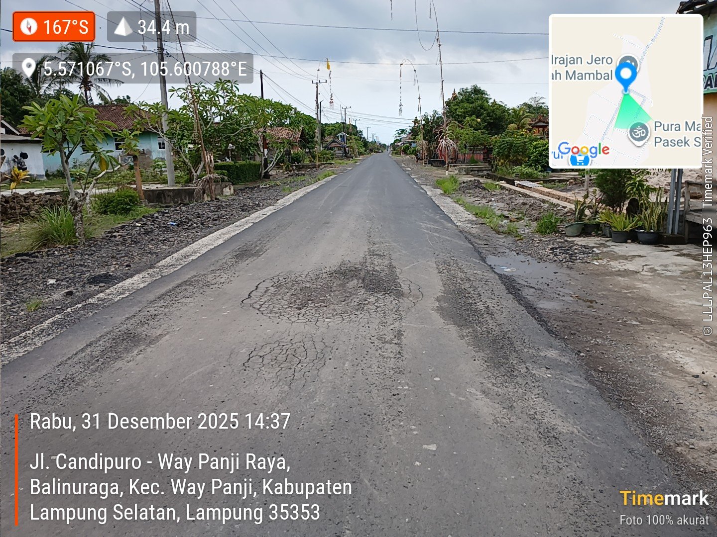 KORANLAMPUNG.ID,Lampung Selatan–Masyarakat Desa Bali Nuraga, Kecamatan Way Panji, Kabupaten Lampung Selatan, menyampaikan kekecewaannya yang sangat mendalam terhadap kondisi jalan yang baru saja dikerjakan, belum genap satu bulan sudah mengalami kerusakan.